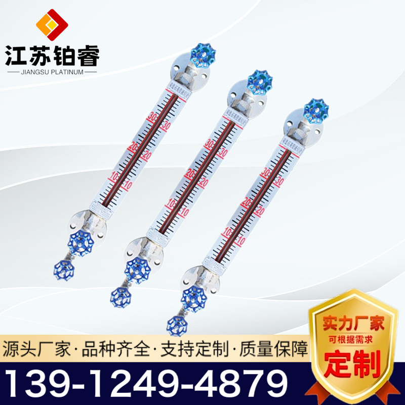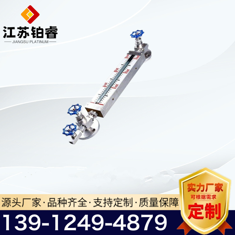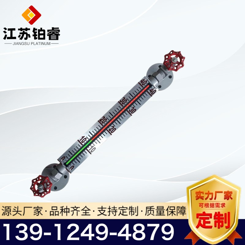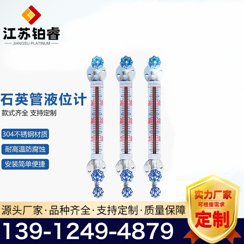由于液气相显示反差大,指示鲜明清晰,所以对远距离操作和夜巡视更为有利。如果带LED光源则显示会更清晰。被广泛用于石油、化工、电力、冶金等行业的各种透明液体容器和锅炉上,如水、汽油、液化气、液氨、丙烷、丙烯、芳烃、酸等油品和化工原料的液位测量。同时对于两种不同介质密度的界面测量,可选用三色界面石英管液位计。三色界面石英管液位计是利用浮力与比重差的原理而设计的,石英管中的小浮子悬浮于两种介质的分界部分,由于浮子呈黑色,上下部分液体颜色有异,所以显示醒目。从而解决了一直困扰在石油化工生产过程中两种混合介质界面分辨不清的难题。它是国内外*理想的直读式液位计。