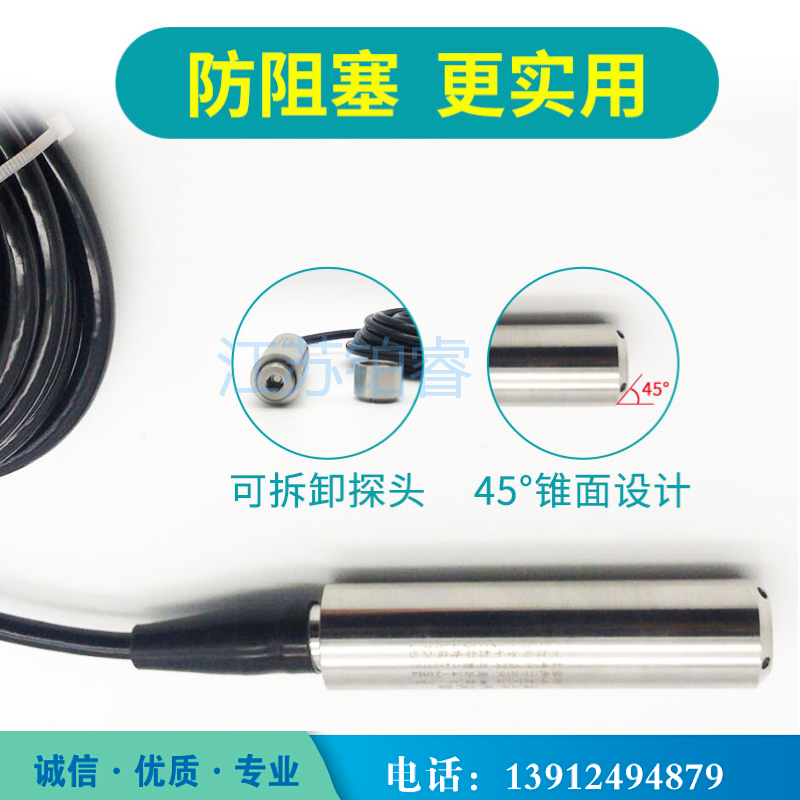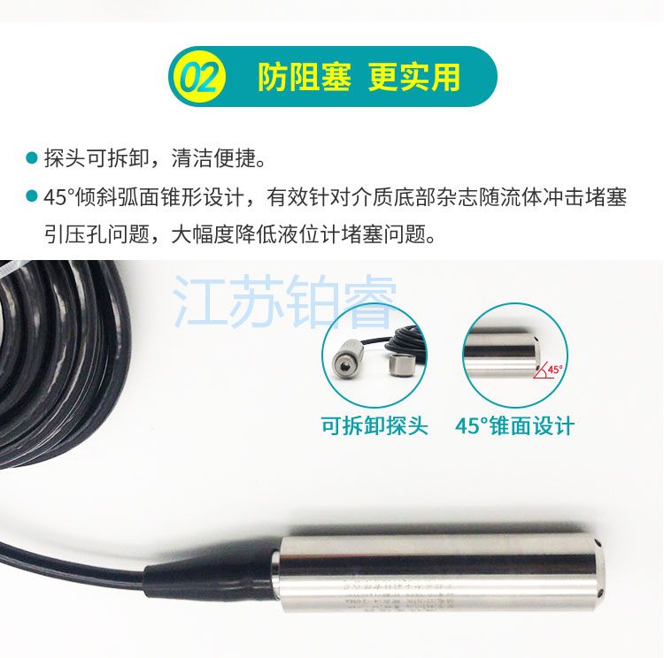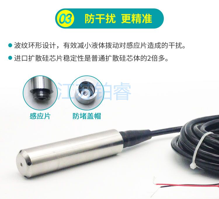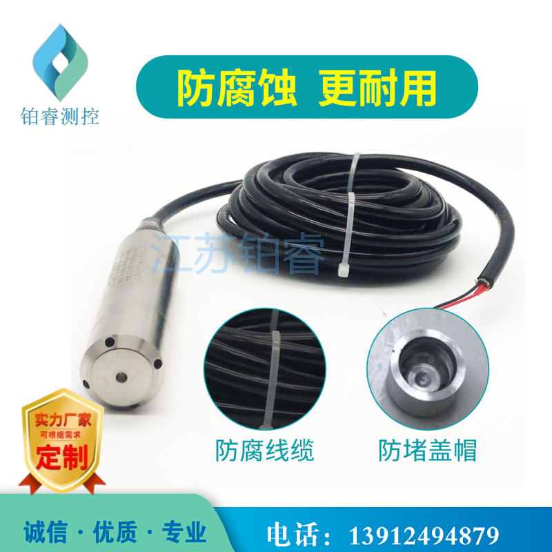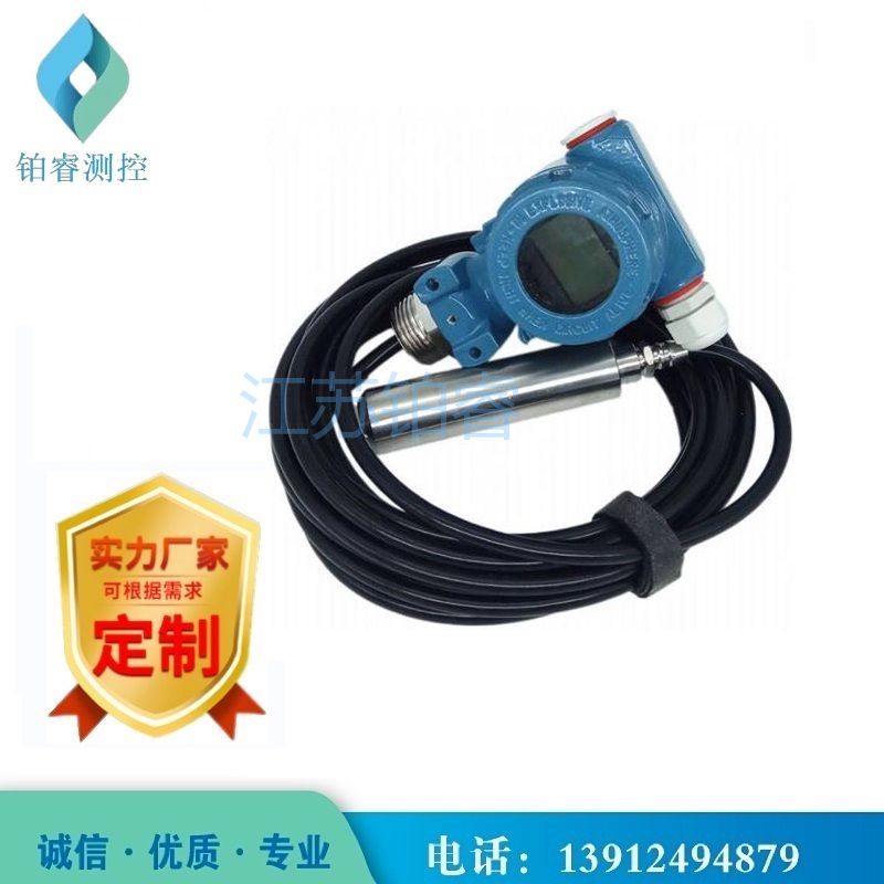 BR-500系列投入式液位计的敏感器件安装在中继箱下端,投人部件为平衡罩,两者之间由导气管(导压)相连,液柱的压力通过空气的传导间接地由导气管传递给敏感部件,这样就避免敏感部器件与被测介质的直接接触。投入式液位计不仅适用于普通水的测量,还适用于高温、粘稠、腐蚀等介质特殊场合的液位测量。广